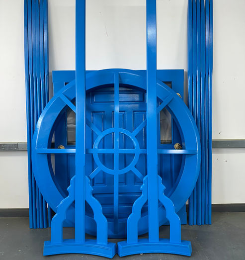 Brand new and unused. A bespoke style yurt with the door, roof poles, crown wheel & crown wheel supports all finished in RAL 5015 Sky Blue. See photos of actual yurt for details.